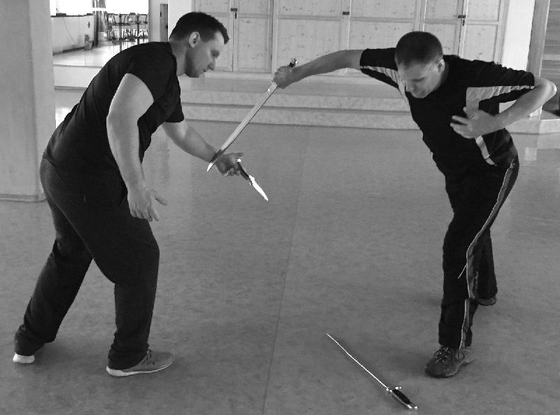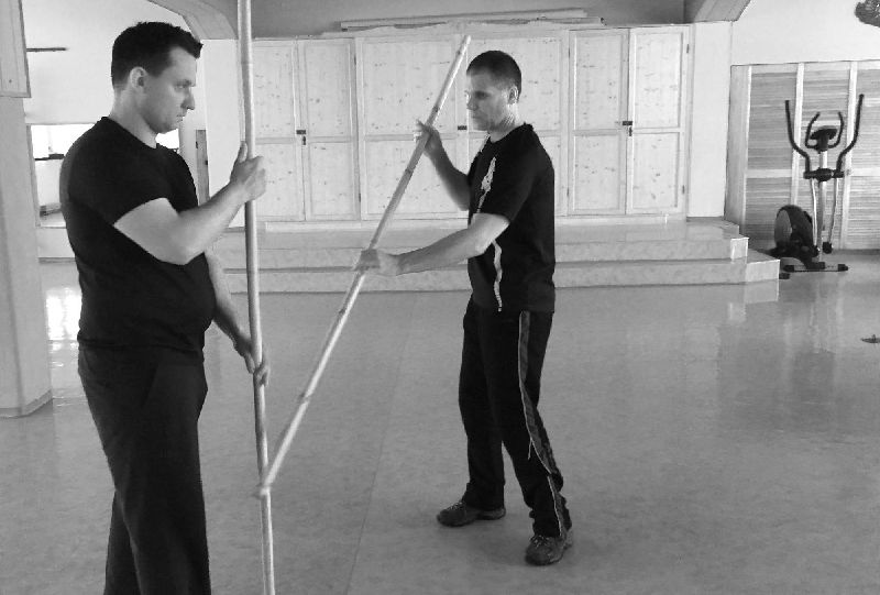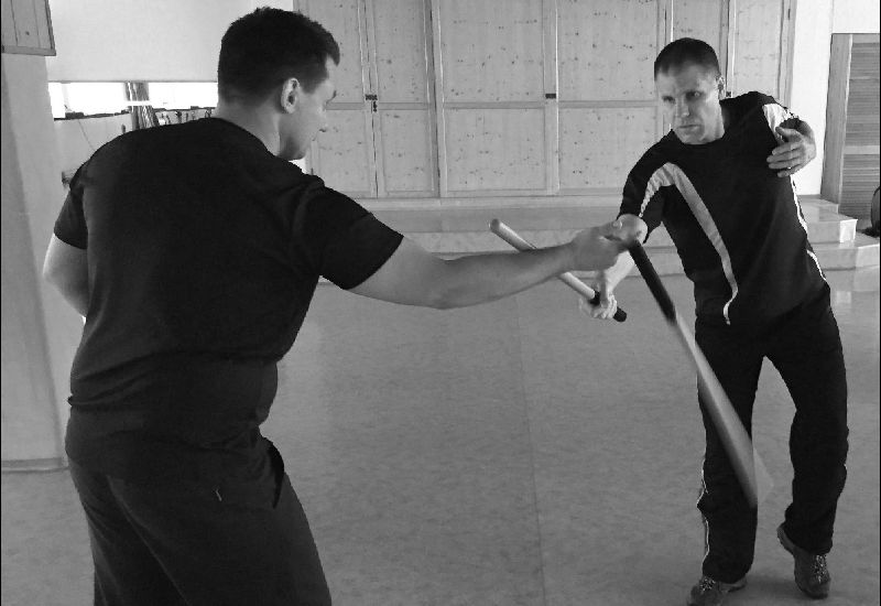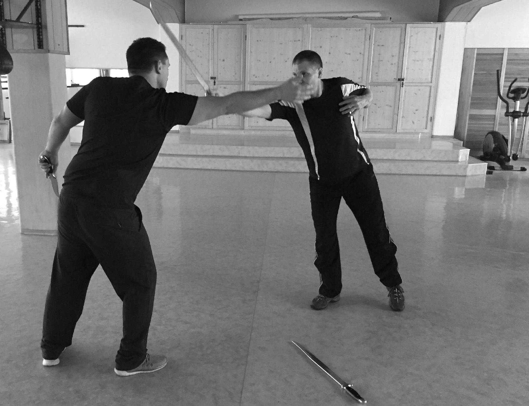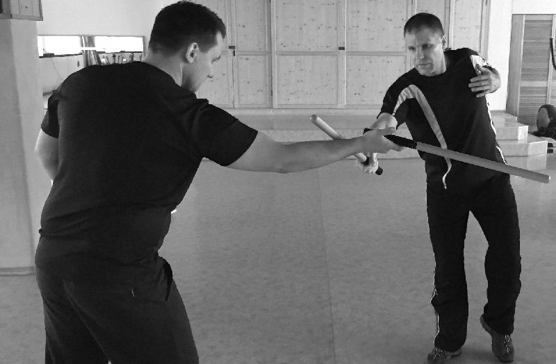Träger-Escrima-Körpergefühl ist ein guter Teil zur Ergänzung. Dazu zählt unter anderem das Pendeln, Meiden, Rollen, immer zu wissen wo sich die Waffe befindet und vieles mehr.
